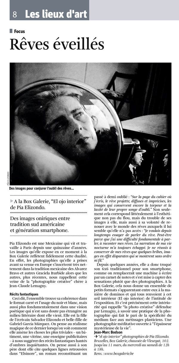 Jean-Marc Bodson, professeur au 75 et critique d'art à la Libre Belgique, consacre un bel article à Pia Elizondo, photographe mexicaine qui expose à la Box Galerie.