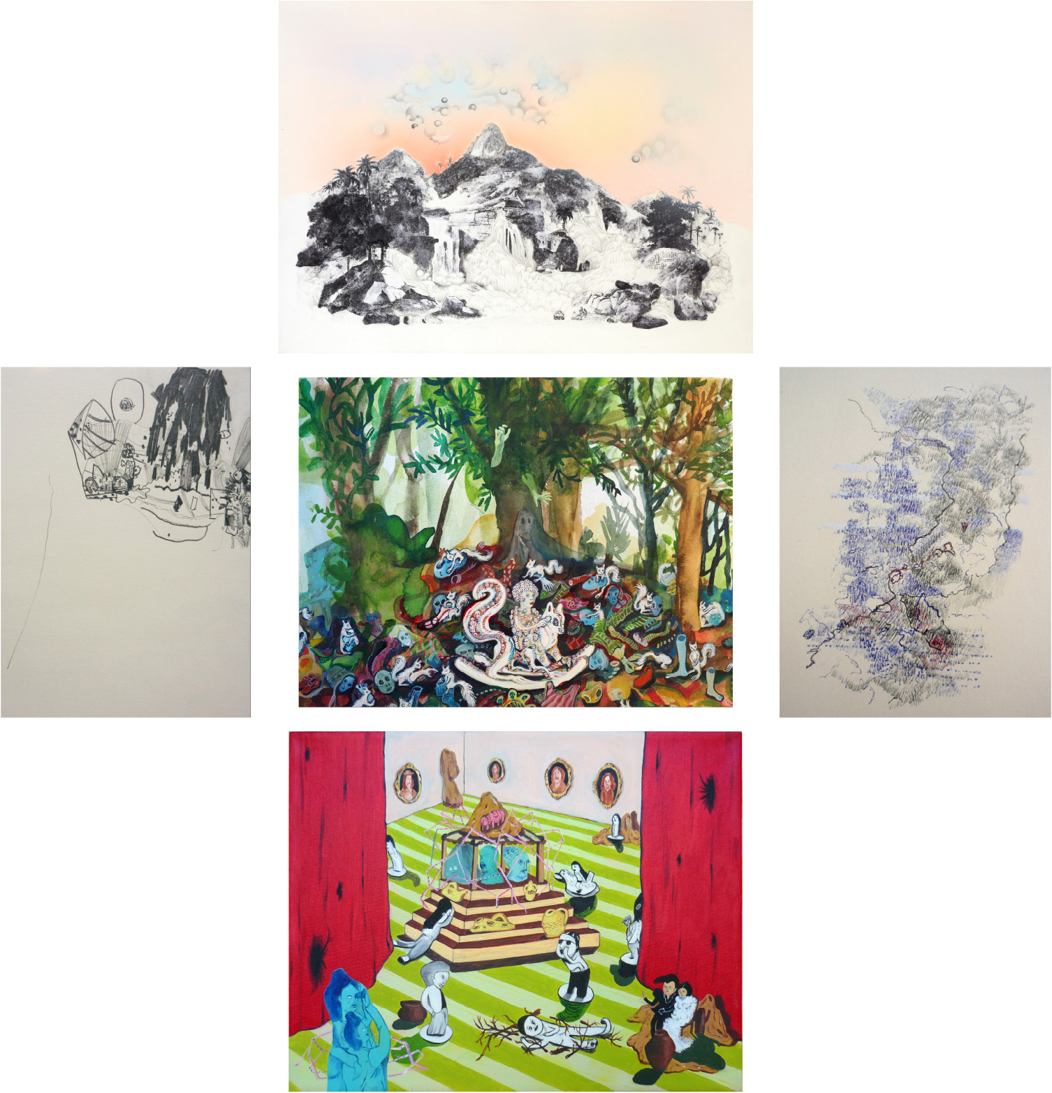 Les dessins de Luis Almeida (Portugal) ont un point de départ figuré qui se transforme, se dérobe au fil des traits. Le crayon prend le contrôle, se fait tour à tour délicat, sauvage, minutieux, construit des univers ramassés dans un coin de la feuille, altère ce qui était littéral. Les petits dessins de Valérie Rouillier (Belgique) brouillent aussi les frontières entre figuration et abstraction. L’œil trouve des paysages, des méandres et des éléments topographiques dans les traces – légères, compulsives, fluides – laissées par le stylo à bille sur la feuille. Anouk Mercier (Royaume Uni) utilise une combinaison de techniques pour recréer à partir de gravures anciennes des perspectives impossibles et luxuriantes, des promenades idylliques sous des cieux illuminés d’exoplanètes couleurs pastel. Chiaki Kamikawa (Japon, Chypre) met en scène un fourmillement de personnages aux occupations incongrues dans des décors aux couleurs vives, proches de l’univers d’un Jérôme Bosch pop. Enfin, Lotte Van De Walle (Belgique) nous revient avec une série d’œuvres récentes sur papier. On retrouve son travail délicat de miniaturiste et sa maîtrise des matières et des transparences. Son univers énigmatique et coloré est ici renouvelé par son récent déménagement en Californie : on y croise des tombes fleuries à la mexicaine, une invasion d’écureuils familiers ou les arbres spectraux des grands parcs américains.