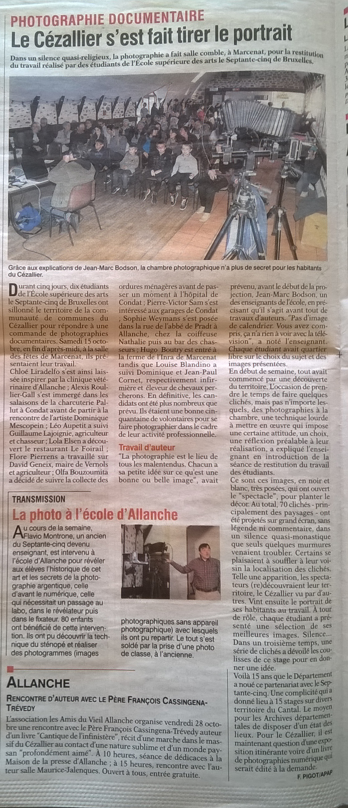 Le stage photographique des étudiants du 75 dans le Cantal s'est achevé par une soirée de restitution au cours de laquelle les habitants ont pu découvrir les travaux réalisés. Jean-Marc Bodson et Flavio Montrone, qui encadrent le stage, ont également partagé une partie de leurs connaissances techniques avec le public et les enfants de l'école d'Allanche.