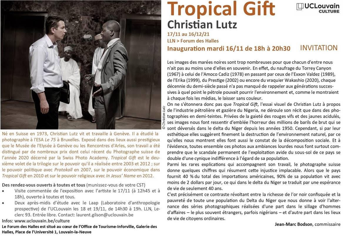Tropical Gift est le deuxième volet de la trilogie sur le pouvoir qu'il a réalisée entre 2003 et 2012 ; sur le pouvoir politique avec Protokoll en 2007, sur le pouvoir économique dans Tropical Gift en 2010 et sur le pouvoir religieux avec In Jesus’ Name en 2012.