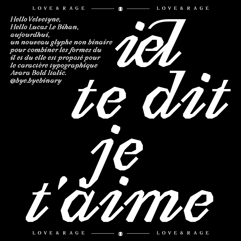 Image : Camille Circlude. Iel te dit je t’aime. Pollinisation : ajout d’un glyphe non-binaire à l’Avara Bold Italic.